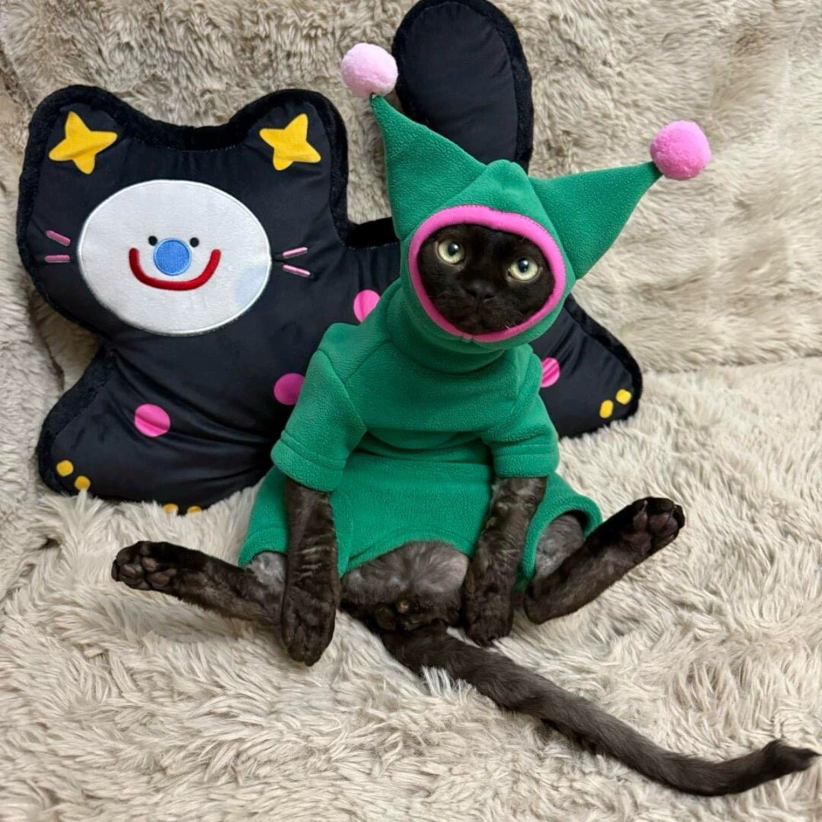 This cozy green alien costume with pink pom-poms turns your pet into the star of every photo session. Perfect for Sphynx cats, Devon Rex, or small pups who love to dress up!
